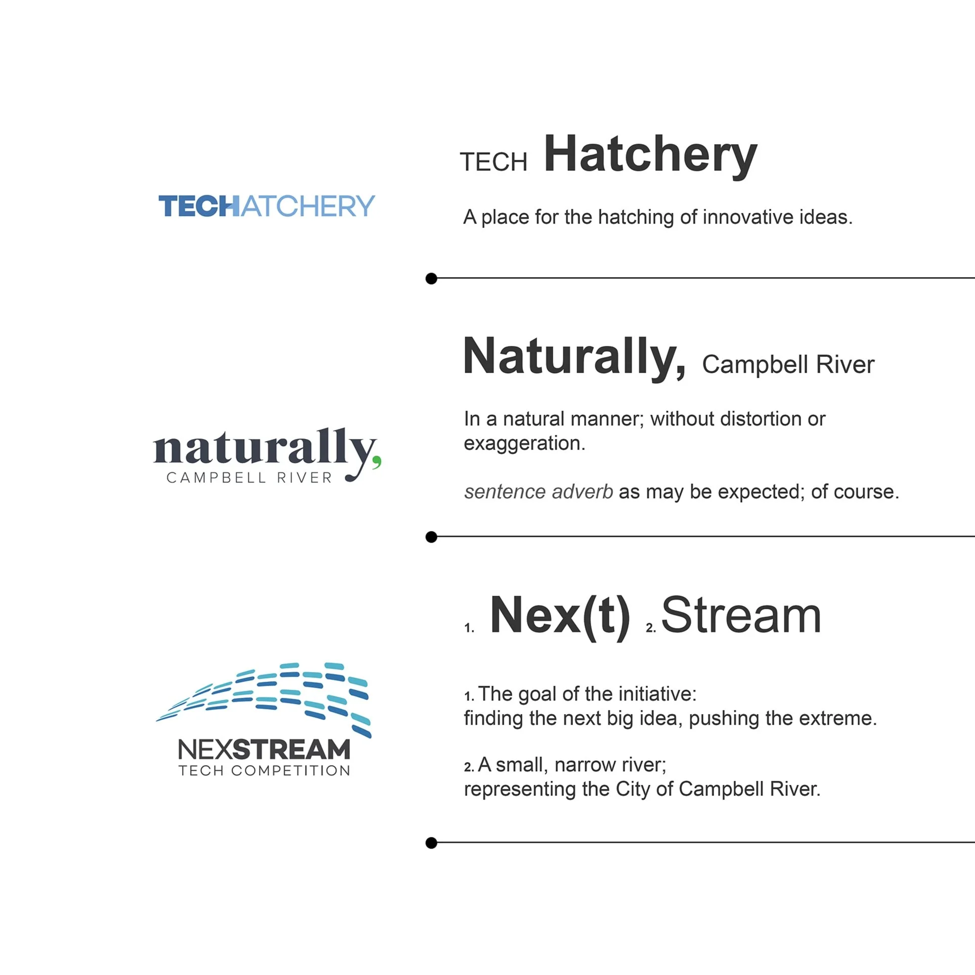 I led the naming process for a new, three-tiered brand architecture designed to completely modernize the city's image. By developing naturally, Campbell River as the overarching economic brand, TECHatchery for tech attraction, and NexStream for their flagship competition, I ensured each initiative had a distinct strategic identity that still cohesively rolled up into the city's broader economic goals.